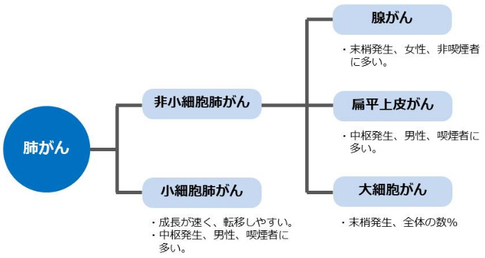 肺がんは組織型により、「腺がん」、「扁平上皮がん」、「大細胞がん」、「小細胞がん」の4つに分けられます。